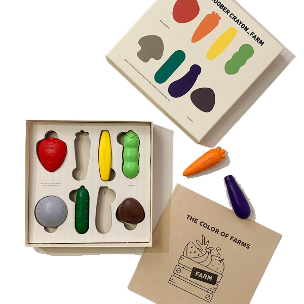 Comme c'est amusant de dessiner avec ces produits de la ferme colorés! Ces 8 crayons ont la forme et la couleur d'une fraise, d'une carotte, d'une banane, d'un petit pois, d'un concombre, d'un œuf, d'une châtaigne et d'un champignon, le tout dans une jolie boîte de rangement avec en bonus un mignon cahier à colorier! Les 8 formes différentes sont conçues pour aider au développement des petits muscles et à la motricité, ainsi que pour rendre la saisie de chaque couleur plus amusante. 8 couleurs dans un joli boitier de carton recyclé fait à partir de cire végétale naturelle et pigments non-toxiques lavable, non toxique et résistant fait en Corée